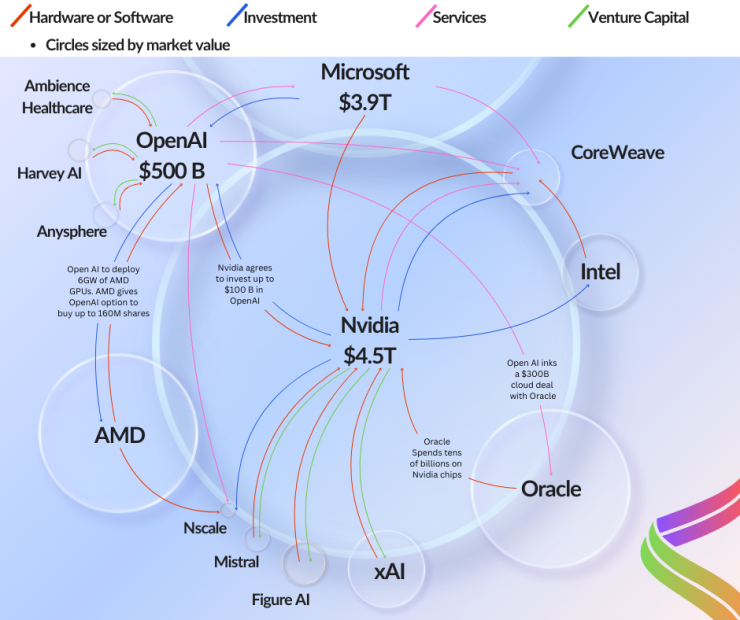 The image shows the dizzying financial round-tripping happening inside the AI world. Let’s unpack it: who is investing in whom, and what do some of these players do?